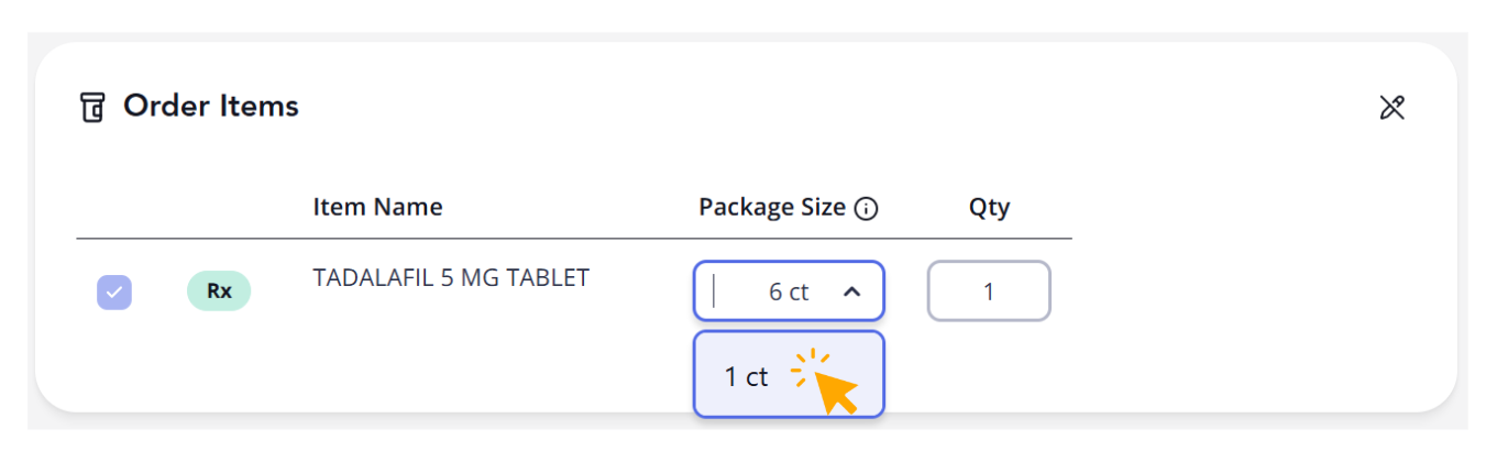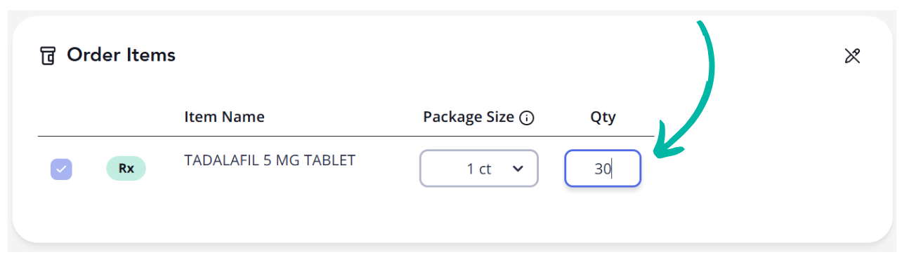 When creating an order from the Prescriptions tab, you have the option to adjust the quantity on order. Orders will be set up based on the quantity written on the Rx - for example, an Rx written for quantity 30 with no refills will set up automatically for package size 30ct. However, an Rx written for quantity 6 with 4 refills will be set up for a package size of 6ct, even though that Rx also has a total of 30 available units (6 for initial dispense and then 4 refills at 6ct each).